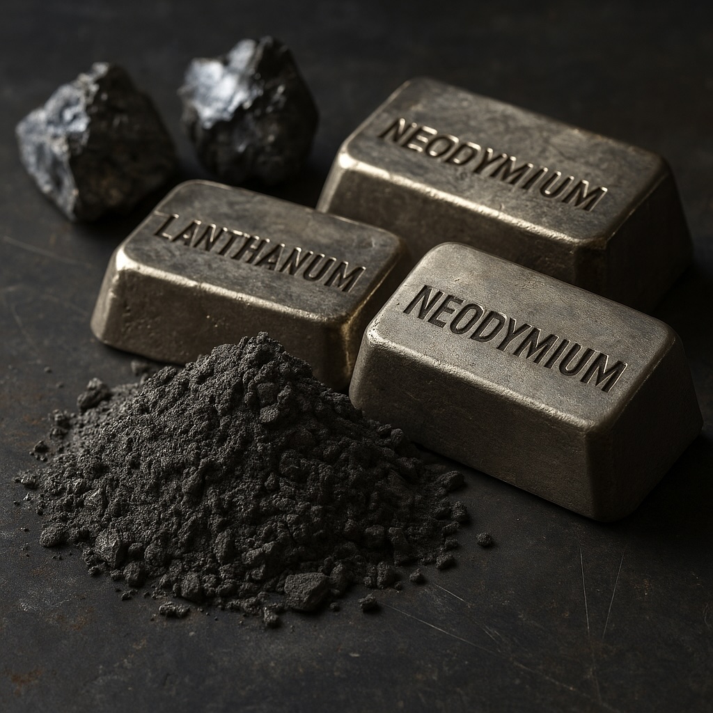 IMAGE: A close-up of metallic ingots labeled “Neodymium” and “Lanthanum” alongside piles of dark mineral ore, under moody industrial lighting that evokes power and control