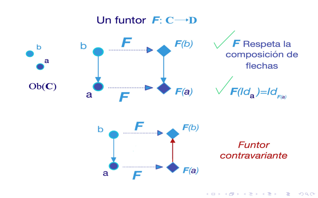 Funtor: Es una «flecha entre categorías», una especie de mapa que relaciona una categoría con otra. Es una forma de pasar de un mundo matemático a otro, manteniendo la estructura.