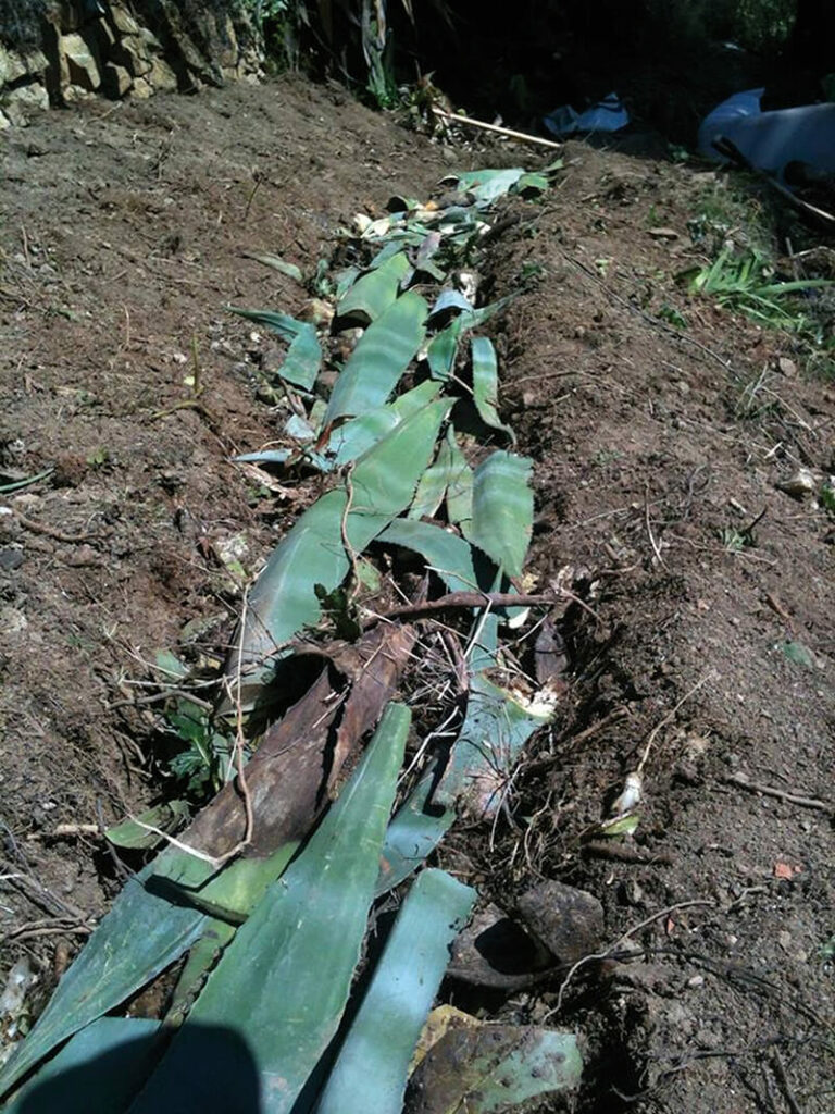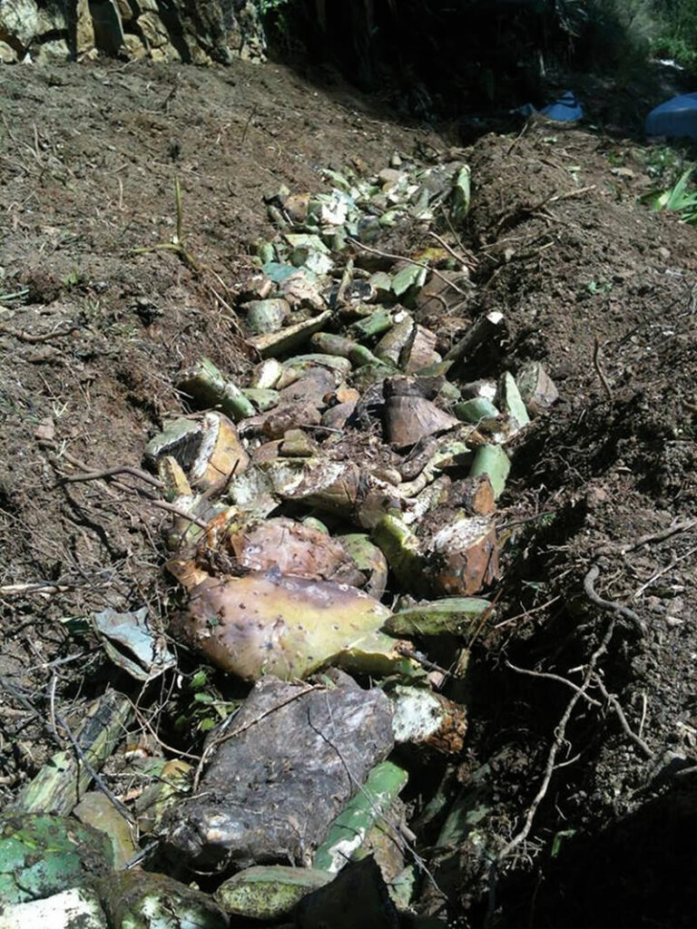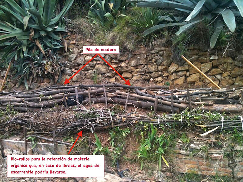 La idea es recoger el agua que viene de la terraza de arriba en un swale. Aguas abajo hay un hügelkultur, con ramas y hojas de agave y chumbera, en el que se plantaron árboles y arbustos y aguas abajo se pusieron biorrollos para frenar la erosión.