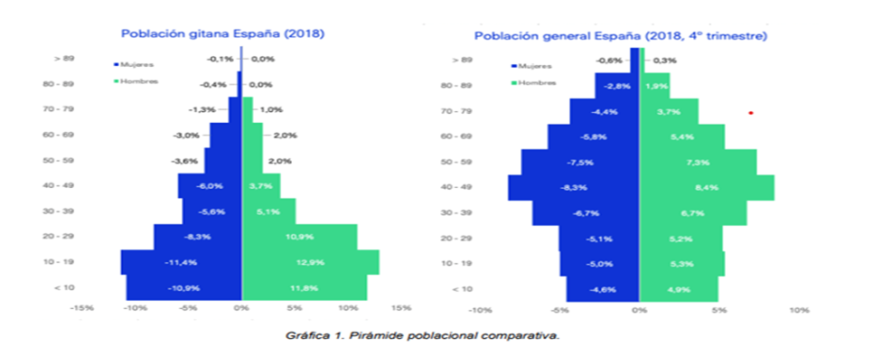 Estas autoras, señalan, además, que la brecha de desigualdad determinada por la condición de ser mujer es muy significativa y afecta a todos los ámbitos: en la situación laboral, en los niveles educativos, en las responsabilidades familiares e incluso en las bajas expectativas y pocas posibilidades de proyección y promoción (2024). Además, otras de las conclusiones del artículo, tal y como se puede apreciar en el gráfico, son las diferencias sociodemográficas respecto a la población general, siendo el 66% de la población gitana menor de 30 años, mientras que sólo el 30% de la población general en España está por debajo de esa edad. La población gitana es, por tanto, muy joven.