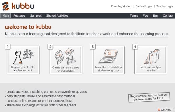 Kubbu genera en línea un buen número de actividades en las que puede basarse la materia de clase. Es posible también la creación de temas completos, lecciones y pruebas de conocimiento (test, exámenes), imprimirlos, enviarlos por correo, compartirlos o dejarlos accesibles en línea. Permite la creación de grupos de trabajo colaborativo y salas (foros) de soporte, facilita el permitir o restringir el acceso a los datos, posibilita la autoevaluación y guarda los resultados para realizar comparativas en el desarrollo del ciclo escolar.