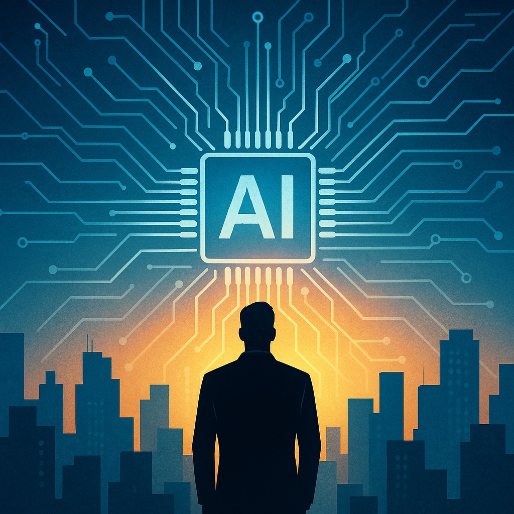 IMAGE: Silhouette of a man facing a glowing AI microchip symbol above a futuristic city skyline