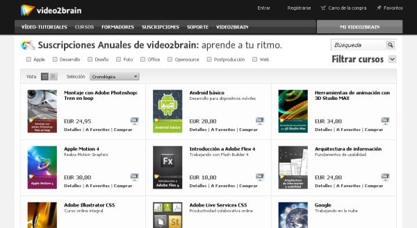 Video2Brain es el portal por excelencia de los cursos de Adobe, no en vano es un centro autorizado por dicha marca, y en él podremos encontrar cursos en vídeo de muy buena calidad, perfectamente estructurados en varios niveles y muy completos. Además de los cursos de Adobe podremos encontrar otros, como el referido al manejo de Windows7 o el curso en el que podremos dominar a la perfección la herramienta social Twitter, aunque su «fuerte», como ya hemos mencionado, son las aplicaciones de Adobe. Todos los profesionales formadores son expertos en la materia que imparten.